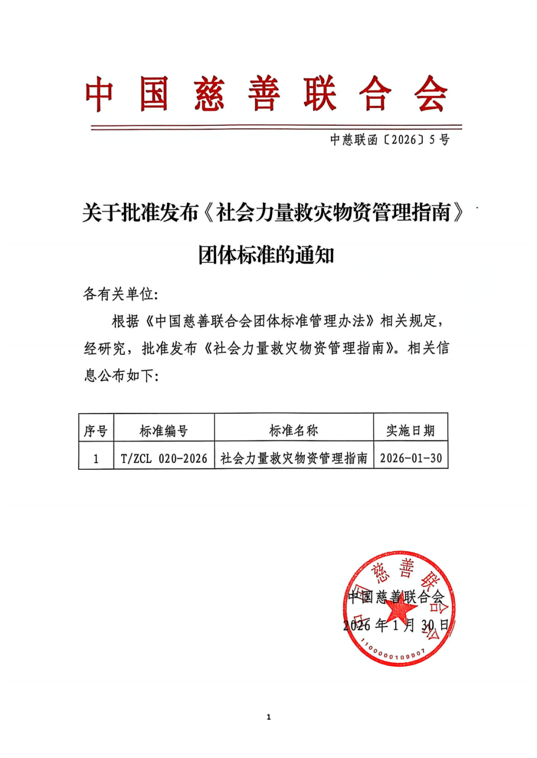 根据《中国慈善联合会团体标准管理办法》相关规定,现将《社会力量救灾物资管理指南》团体标准予以发布。相关信息公布如下: